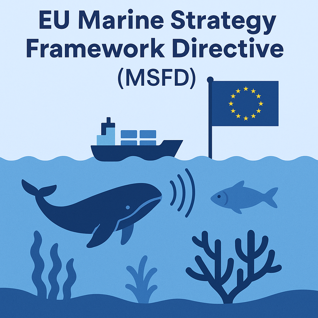 The EU Marine Strategy Framework Directive (MSFD) guides marine noise research by requiring member states to assess and achieve Good Environmental Status (GES) of their marine waters. This includes monitoring underwater sound level, identifying noise sources such as vessel traffic, and assessing their impact on marine life through spatial and temporal distribution assessments.