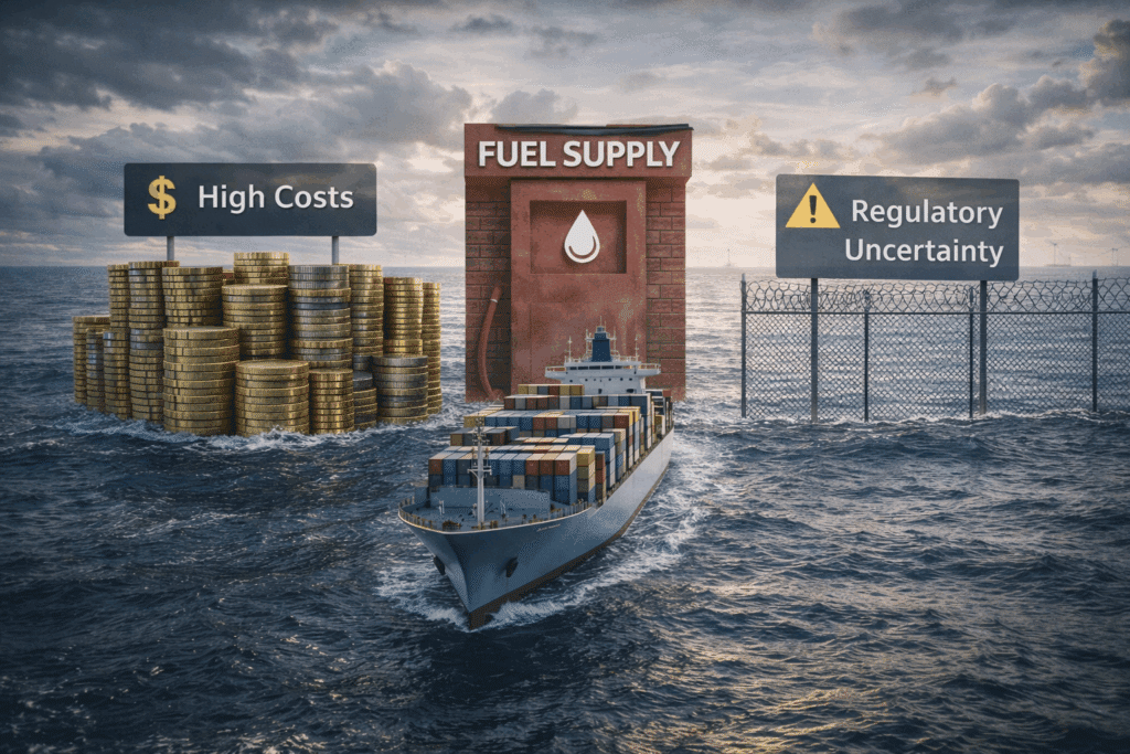 Fuel cost uncertainties compound investment risks. New fuels like renewable ammonia and synthetic options currently cost 2-4 times conventional marine fuels. Shipowners making 20-30 year decisions confront trajectories that could render their fleet economically uncompetitive. As a result, this uncertainty paralyzes decision-making for operators lacking financial reserves.